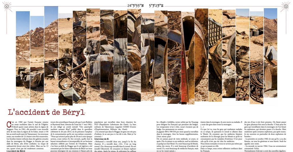 24°3'55''N 5°3'23''E est un travail dans lequel je reviens sur les essais nucléaires français effectués dans le désert algérien. C’est le point zéro de l’accident Béryl (du nom de code de l’essai), survenu dans la matinée du 1er mai 1962, à In Ekker, à environ 1800 km au sud d’Alger – c’est le deuxième test, sur les treize tirs nucléaires souterrains opérés au mont Taourirt Tan-Afella, selon l’appellation targuie. En effet, l’essai de l’AN-11, première bombe stratégique française au plutonium, provoque une profonde fissure dans la montagne.