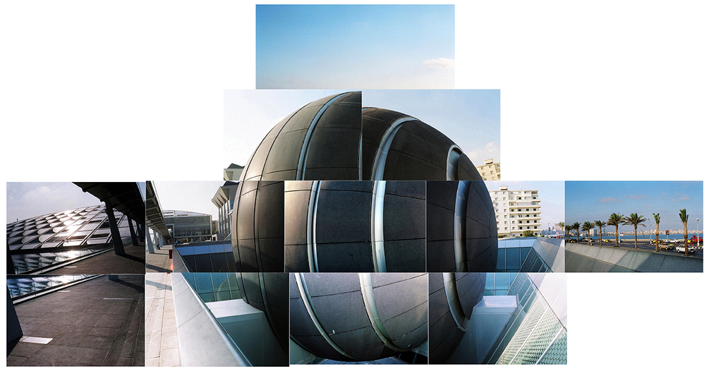 By: Ammar Bouras. This photographic montage was created in September 2004 as part of a workshop in Alexandria. It offers an architectural and visual decomposition of the Library of Alexandria, a symbolic space of knowledge and collective memory. Through a fragmented format, the work reinterprets the place by playing with reality and abstraction: surfaces, volumes, and reflections become the materials of a visual sculpture that transcends mere decor to become a perceptual experience.