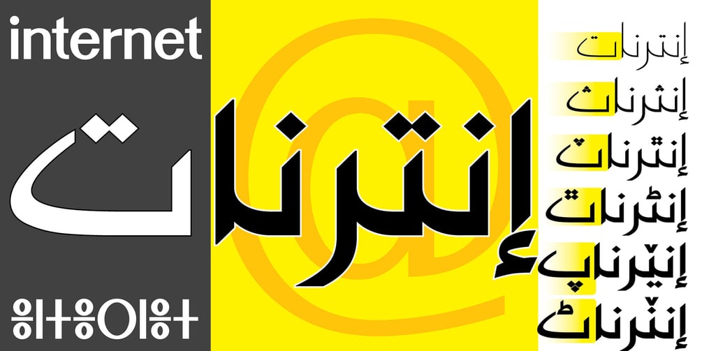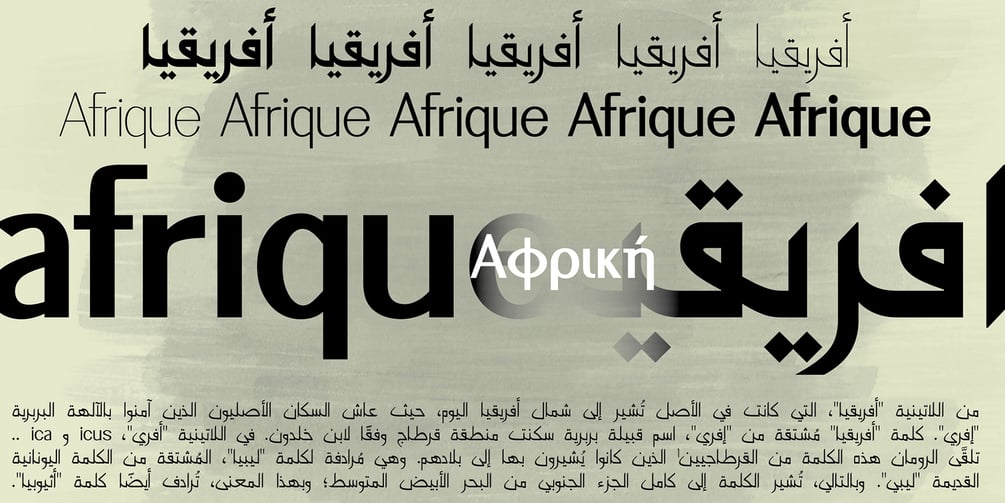 AlgerBlanche brings together more than 2,200 glyphs and combines four scripts—Arabic, Latin, Greek, and Tifinagh—into a single typeface family for a coherent and versatile visual expression. Drawing inspiration from the gestures and rhythms of Arabic calligraphy, Naskh, and Kufic, it highlights local and geographical phonetic particularities while ensuring consistent legibility across print and digital media. The design prioritizes a sculptural harmony between the scripts: shapes and proportions interact to create a unique typographic identity capable of orchestrating messages across various media—logos, visual identities, interfaces, packaging—while remaining legible at different resolutions. The goal is to harmonize these four writing systems so they function together in the same compositional configurations and on the same graphic palettes. This visual continuity reinforces the brand image, combining traditional elegance with the modernity of contemporary design, and offers a smooth and consistent typographic experience.